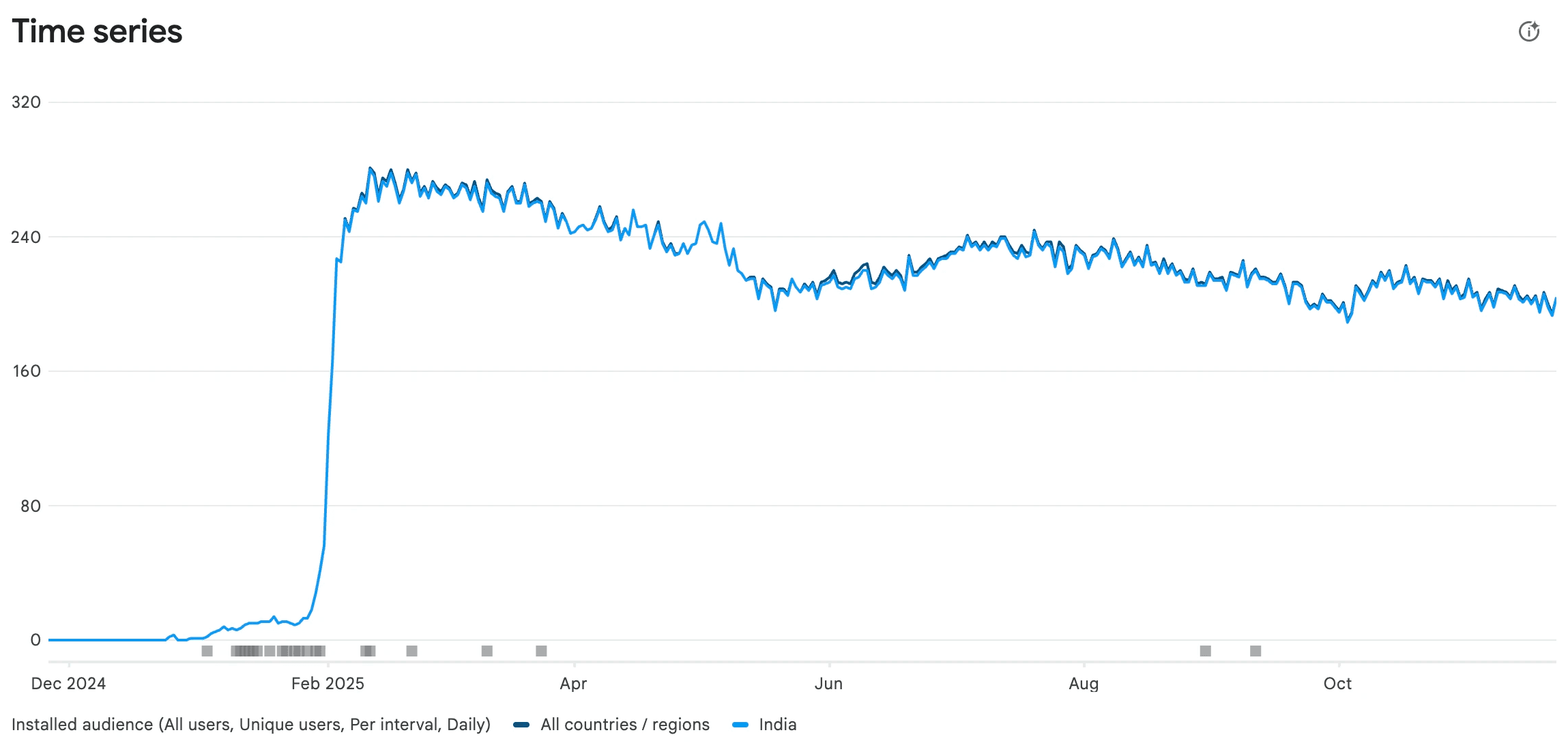 After mid-September 2025, there was a slight downturn in Android growth, with installs generally staying between 200 and 220. As expected, the download and usage of the Android app is more than double the downloads for iOS.