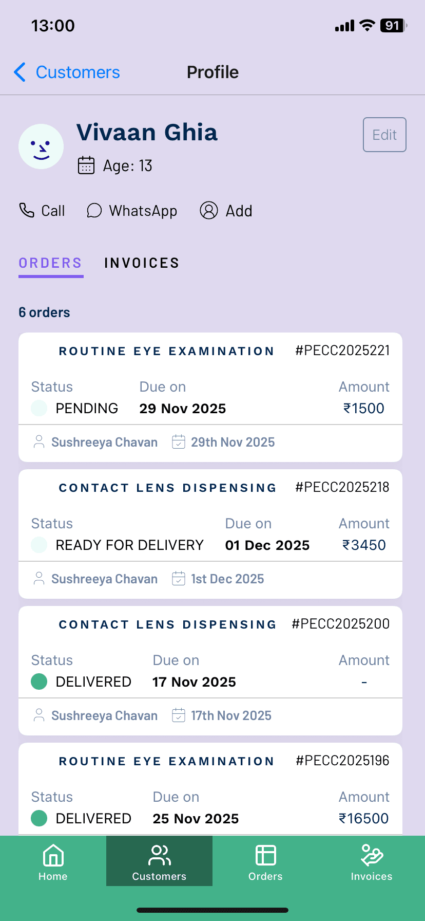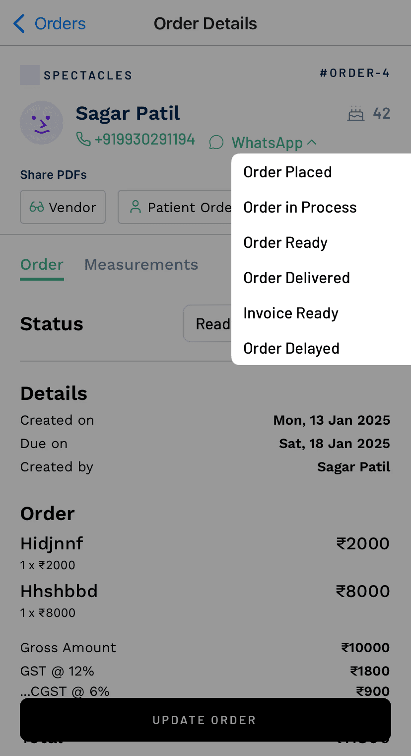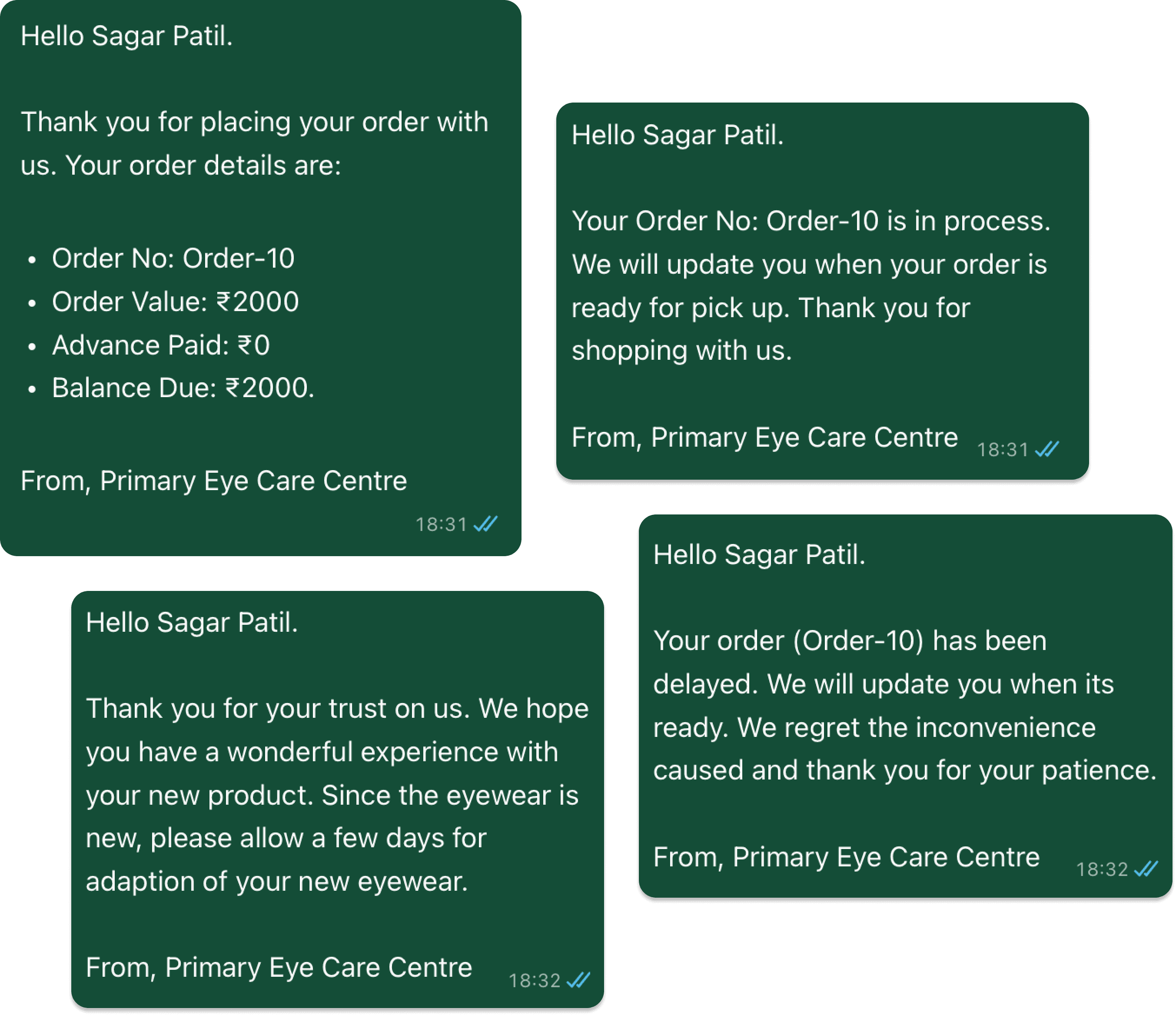 Communicate with and send order updates to customers directly from the optical stores phone number. Call the user directly if required.