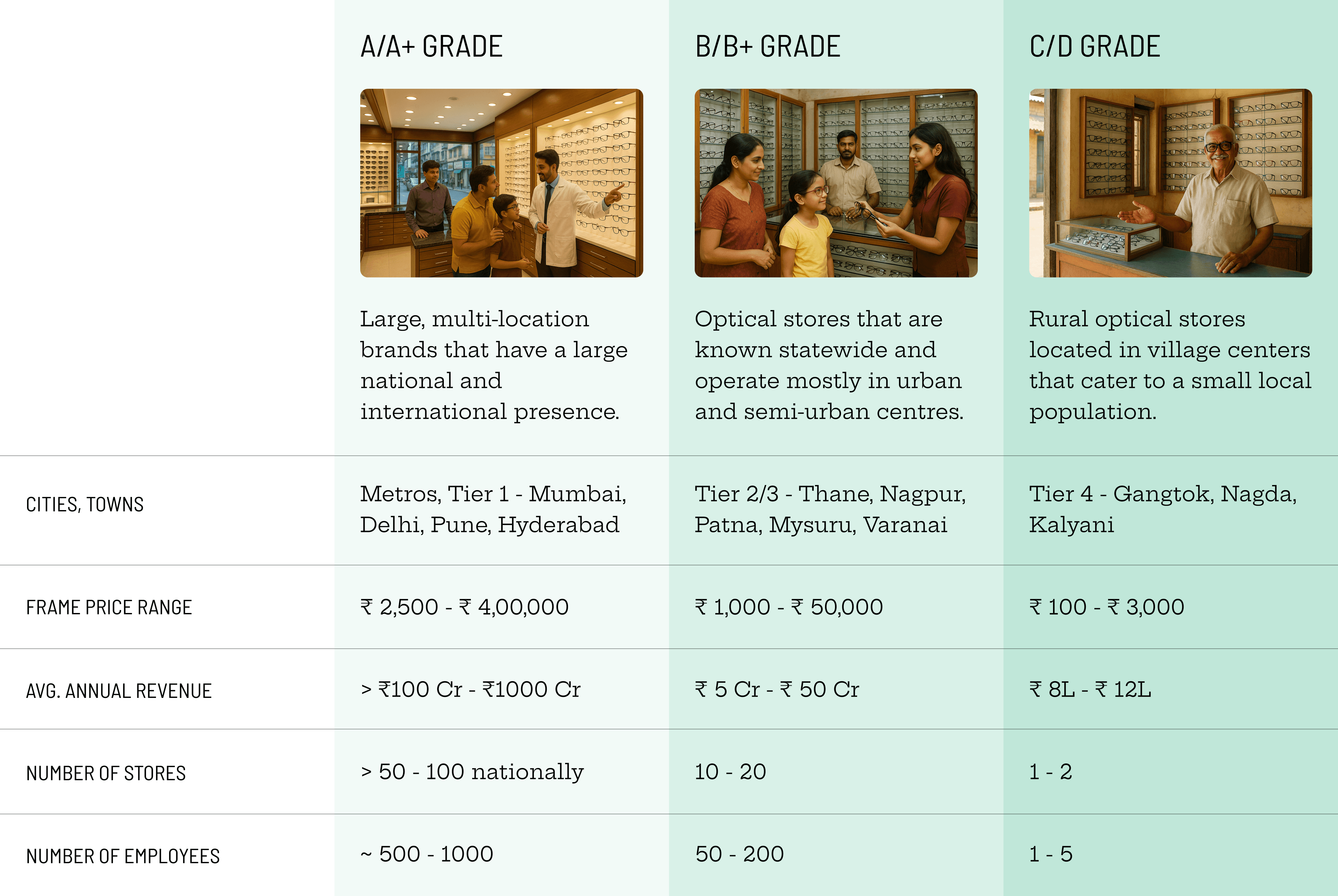 The optical market in India is highly unregulated and at the moment, there are no governing bodies that have established any regulations. As a result, opticians are generally grouped together based on their size and their presence in the different population based cities - metros, urban centres, semi-urban centres and rural centres or villages.